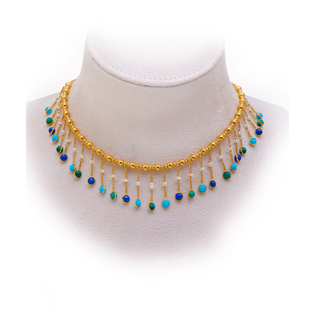 ذهب أصفر عيار 22 (19.765 جرام)، فيروز, ملكايت، لابيزابيز لازولي (2.5 جرام)، ولؤلؤ بحريني طبيعي (0.45 جرام) تقريبًا.
