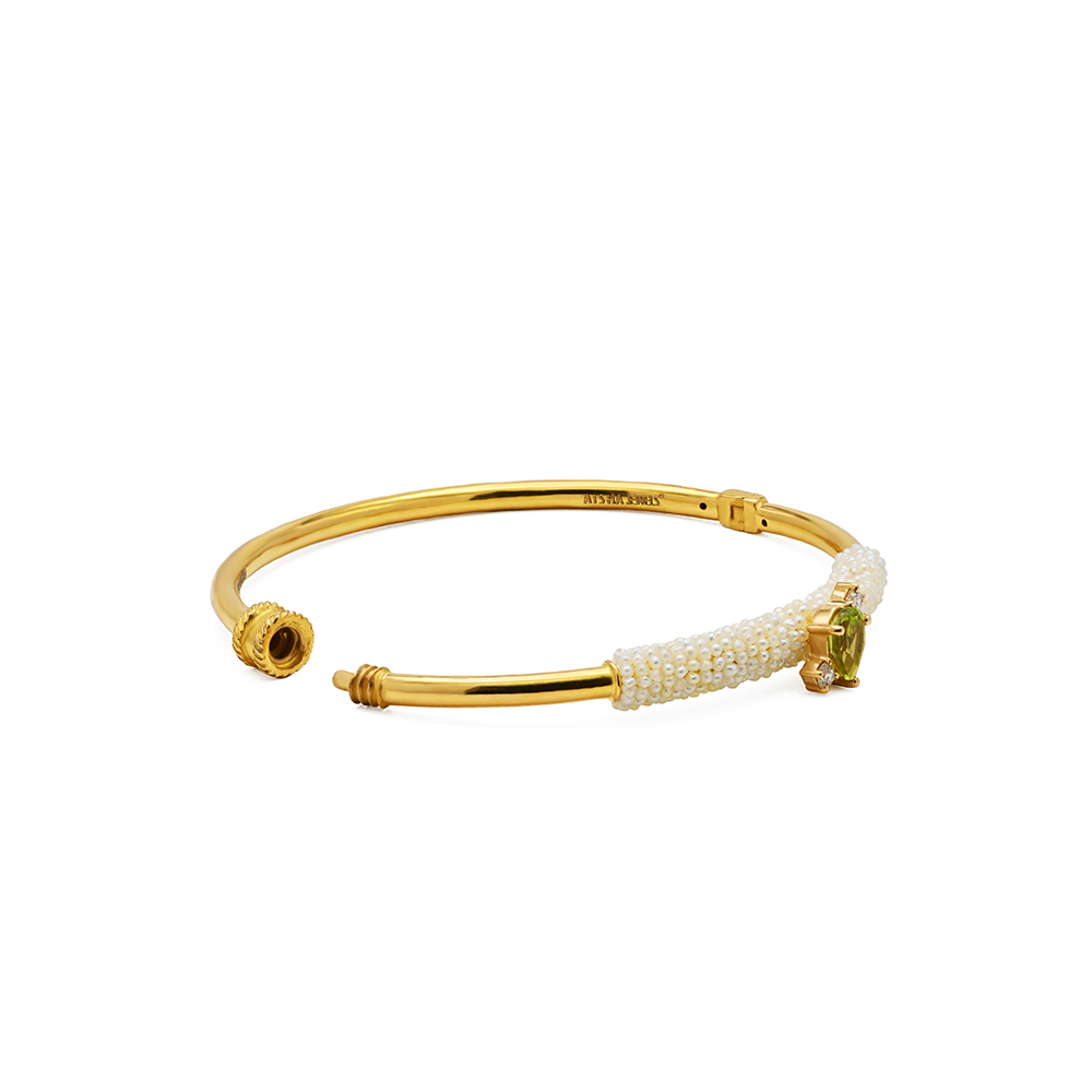 ذهب أصفر عيار 22 (8.275 جرام)، مرصع بالألماس درجة ڤي اس، اللون جي (0.07 قيراط)، زبرجد (0.083 جرام)، ولؤلؤ بحريني طبيعي (0.881 جرام) تقريبًا.